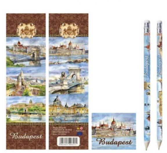 Praktikus és hasznos ajándékcsomag. Tartalma: Budapest mintájú könyvjelző, radír és 2 darab grafitceruza.