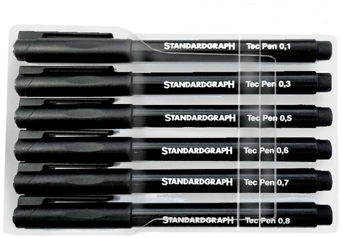 Magas minőségű Standardgraph műszaki tollak ideálisak egyetemi hallgatók vagy tervezők számára. Ideális rajzolásra, írásra és vázlat készítésre. A precízen megmunkált hegy és az ergonómikus markoló garantálják a kényelmes használatát. A toll magas pigmentszámú fekete tintával van töltve. A kemény krómozott hegy lehetővé teszi a sablonnal való használatát is. A csomag 6 db műszaki tollat tartalmaz:A szett tartalma:1 x toll 0,1 mm heggyel1 x toll 0,3 mm heggyel1 x toll 0,5 mm heggyel1 x toll 0,6 mm heggyel1 x toll 0,7 mm heggyel1 x toll 0,8 mm heggyel