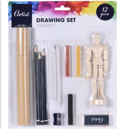Rajzkészlet művészeknek művészeti oktatáshoz. 12 darabos készlet. A készlet tartalma: HB, 5B és 6B keménységű ceruza, hegyező, radír, 2 db papírfeszítő, 3 db pasztellkréta, papírcső és fafigura (155 mm-es méret).