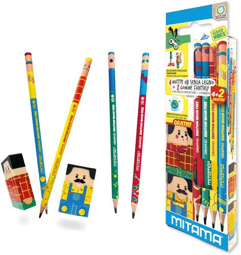 MITAMA 4db-os Ceruzakészlet és Karakteres Radírok Fedezze fel a MITAMA grafit ceruzakészletét, amely nem csak a rajzolás élményét nyújtja, hanem egyedi, karakteres designjával is kitűnik. A készlet négy különböző mintázatú ceruzát tartalmaz, melyek mindegyike egy-egy vidám karaktert ábrázol, így garantáltan felhívják a figyelmet és örömet okoznak használat közben. Kulcsjellemzők: