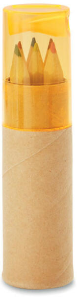 6 db színes ceruza henger alakú, újrahasznosított papírból készült tokban. Hegyezővel az átlátszó tetőben.