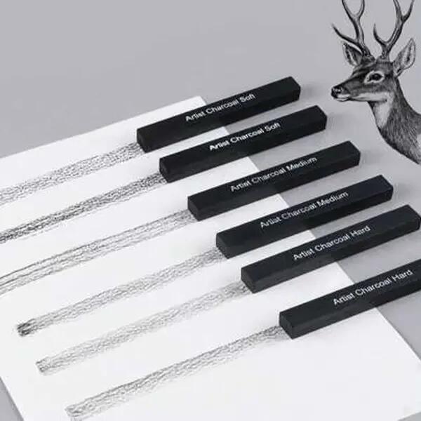 Kemény (hard) -  Világosabb vonalakat ad, nehezebben kenődik el. Finom részletek, kontúrok, szerkezeti vázlatok készítéséhez ideális. Kevésbé porzik, tartósabb. A préselt szén mérete 1x1x8 cm A készlet tartalma: